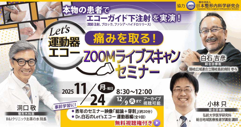 一般社団法人 日本整形内科学研究会(JNOS)は、2025年11月24日に株式会社ケアネット様が主催をされるセミナー 【Let’s 運動器エコー 痛みを取る!ZOOMライブスキャンセミナー】への協力をさせていただくことなりました。