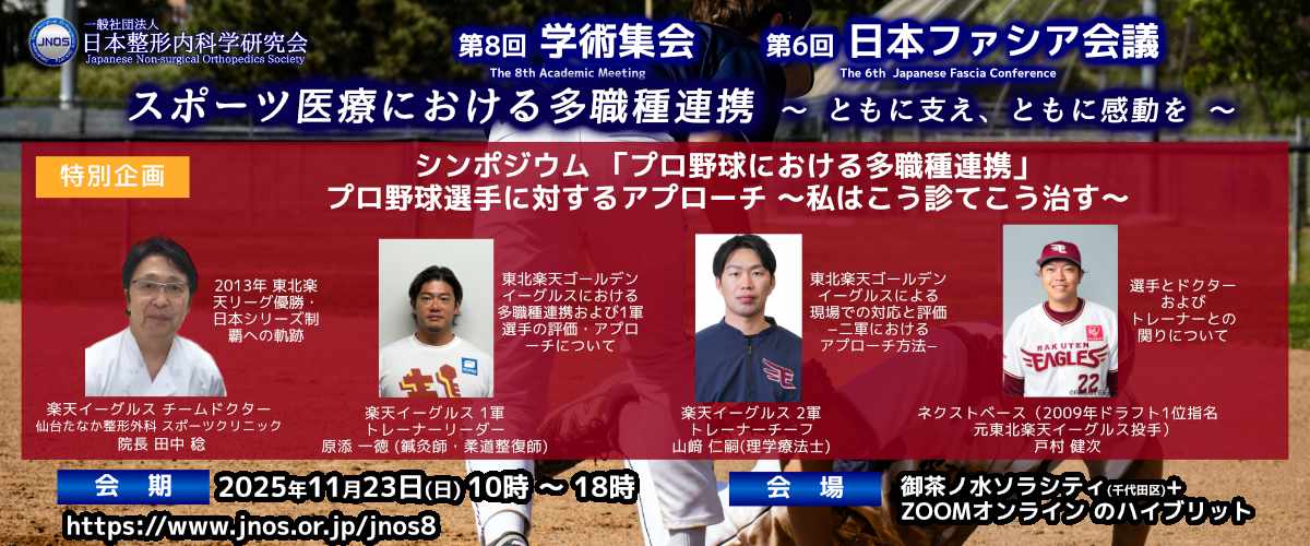 シンポジウム「プロ野球における多職種連携」詳細決定 - お知らせ2025年11月23日(日)に開催する「第8回学術集会」及び「第6回日本ファシア会議」でのシンポジウムの演題等詳細が決定しました。スポーツ医療における非常に興味深い内容となっておりますので、まだ、お申込みでない方は是非ご検討ください。詳細、お申込み方法こちらになります。(申込締切は11月14日(金)となります) 更新日:2025年11月8日 / 日本整形内科学研究会