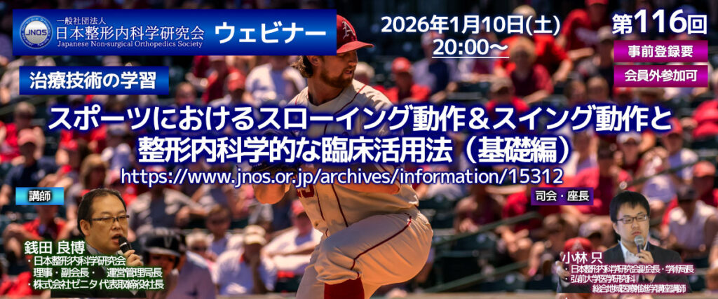 一般社団法人 日本整形内科学研究会では、2026年1月10日(土) に第116回 JNOSウェビナー[Web Seminar] を開催いたします。