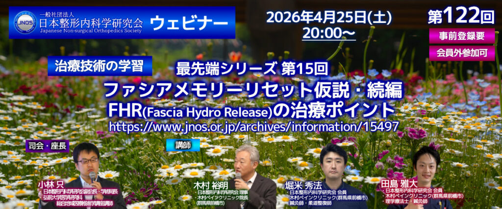 - 第109回JNOSウェビナー(2025年7月26日 20:00~):分野「治療技術の学習」、「最先端シリーズ 第13回|腰背部痛・腰下肢痛(突発性横隔神経麻痺の治療の応用含む)へのFasciaハイドロリリース」、講師:木村裕明、木村ペインクリニックスタッフ(堀米、田島)、司会:小林只、申込みページ